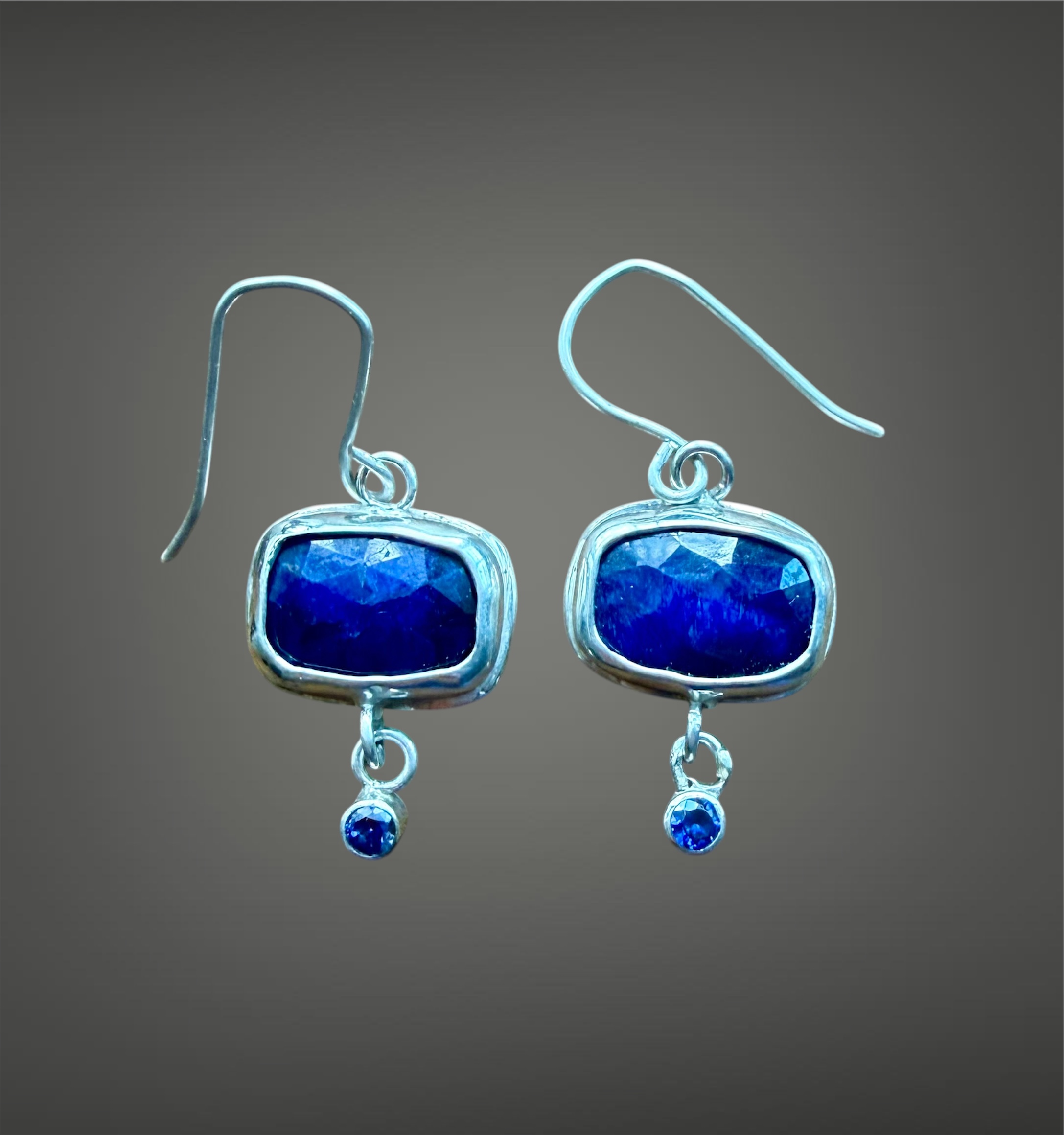 Sterling silver drop earrings with east-west bezel set rose cut Sapphires with 3mm diamond cut Sapphire drop accents. Earrings were one of the most popular pieces of jewelry among Roman women.