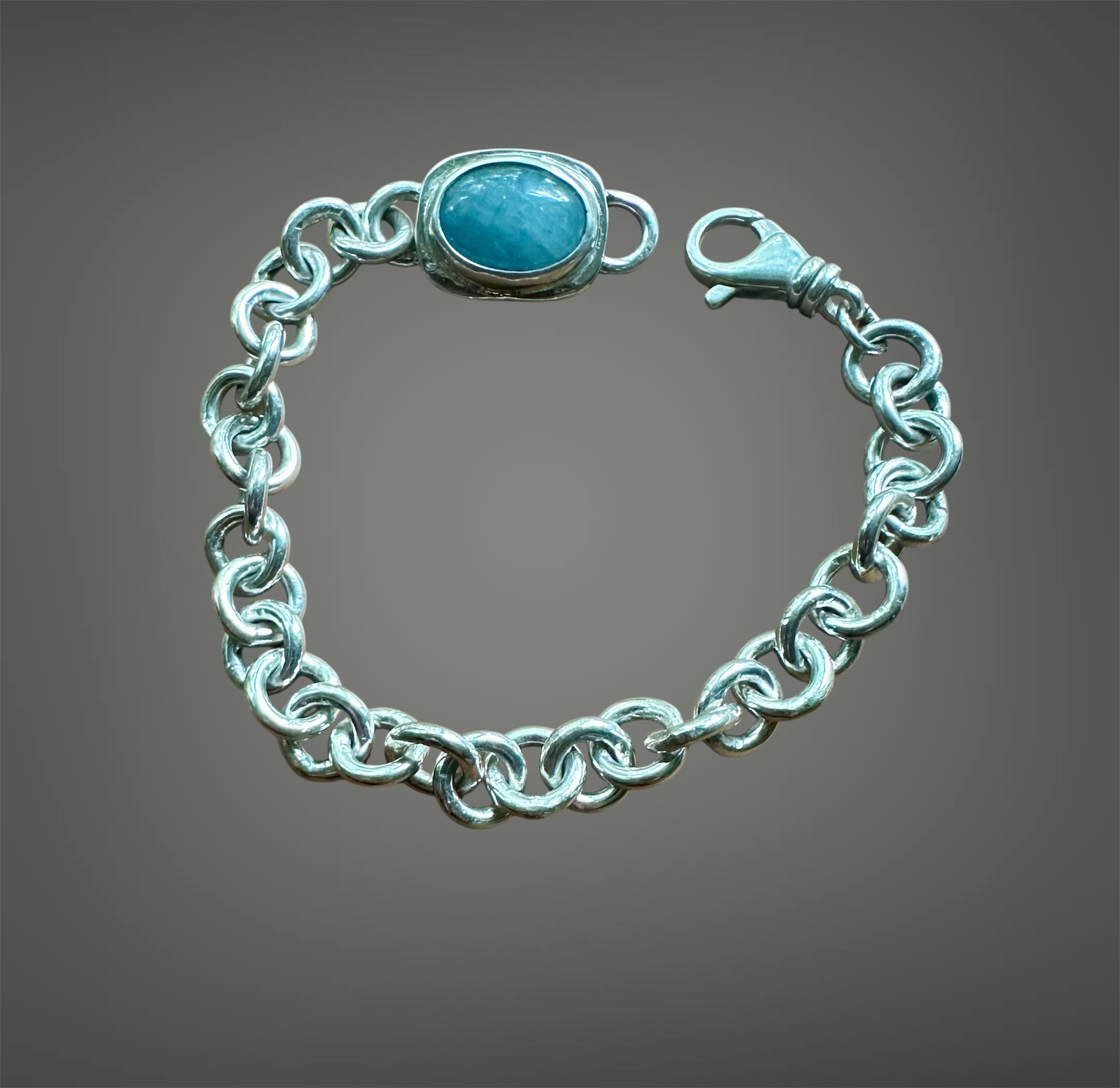 Sterling silver bracelet with a heavy handmade rolo chain, bezel set Aquamarine, and a front clasp closure.